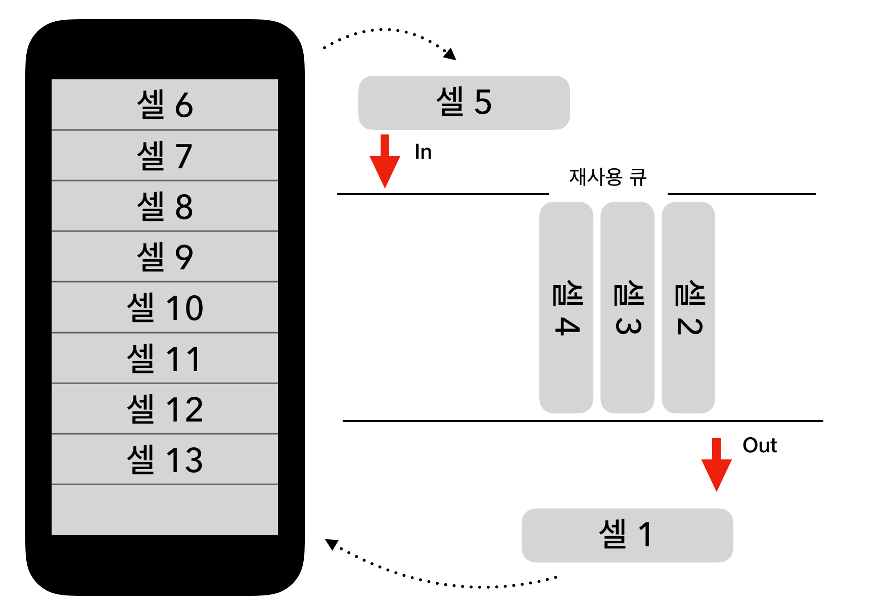 - 데이터 소스는 요청마다 새로운 셀을 만드는 대신 재사용 큐(Reuse Queue)에 재사용을 위해 대기하고있는 셀이 있는지 확인 후 있으면 그 셀에 새로운 데이터를 설정하고 없으면 새로운 셀을 생성한다.