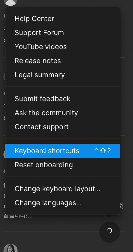 우측 하단 ? 버튼 > Keyboard shortcuts를 클릭.